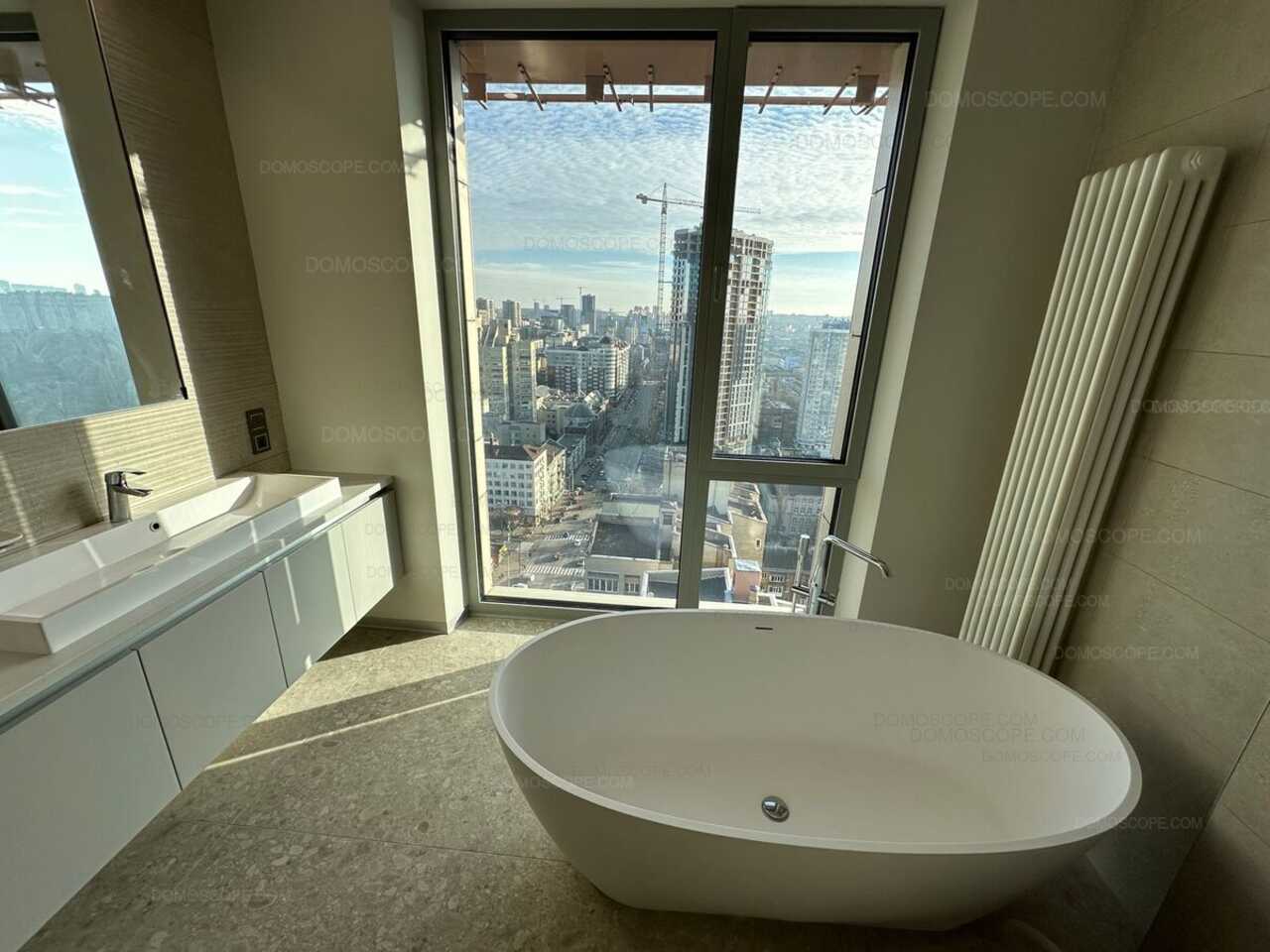 Просторий зал-студіо з великими панорамними вікнами та чудовим видом на Печерськ. Основна спальня з вбиральні, друга